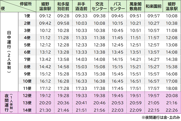 ※運行期間中の金曜日と土曜日は日中(11便)に加えて夜間便(3便)を運行