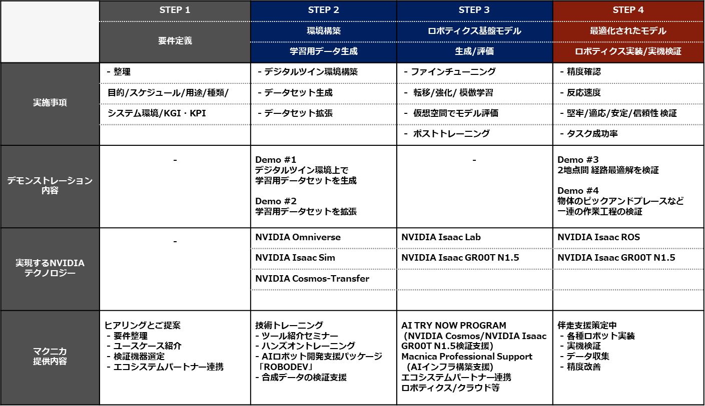 マクニカでは、NVIDIAの「3コンピューター ソリューション」(AI学習基盤、仮想空間シミュレーション用のインフラ、エッジAIデバイス)を自社内で採用し、協働ロボットの実機を利用したPhysical AI検証環境を整備・構築しました。このデモンストレーションでは、仮想空間でロボットの学習用データを生成・拡張し、現実空間で物体のピックアンドプレースなど、AIモデルの開発から実機検証までを一貫して実現できます。マクニカは、ロボティクス・AIの開発から導入・運用までを担う産業エコシステム全体に対して、国内のAI実装と社会実装の加速を支援します。