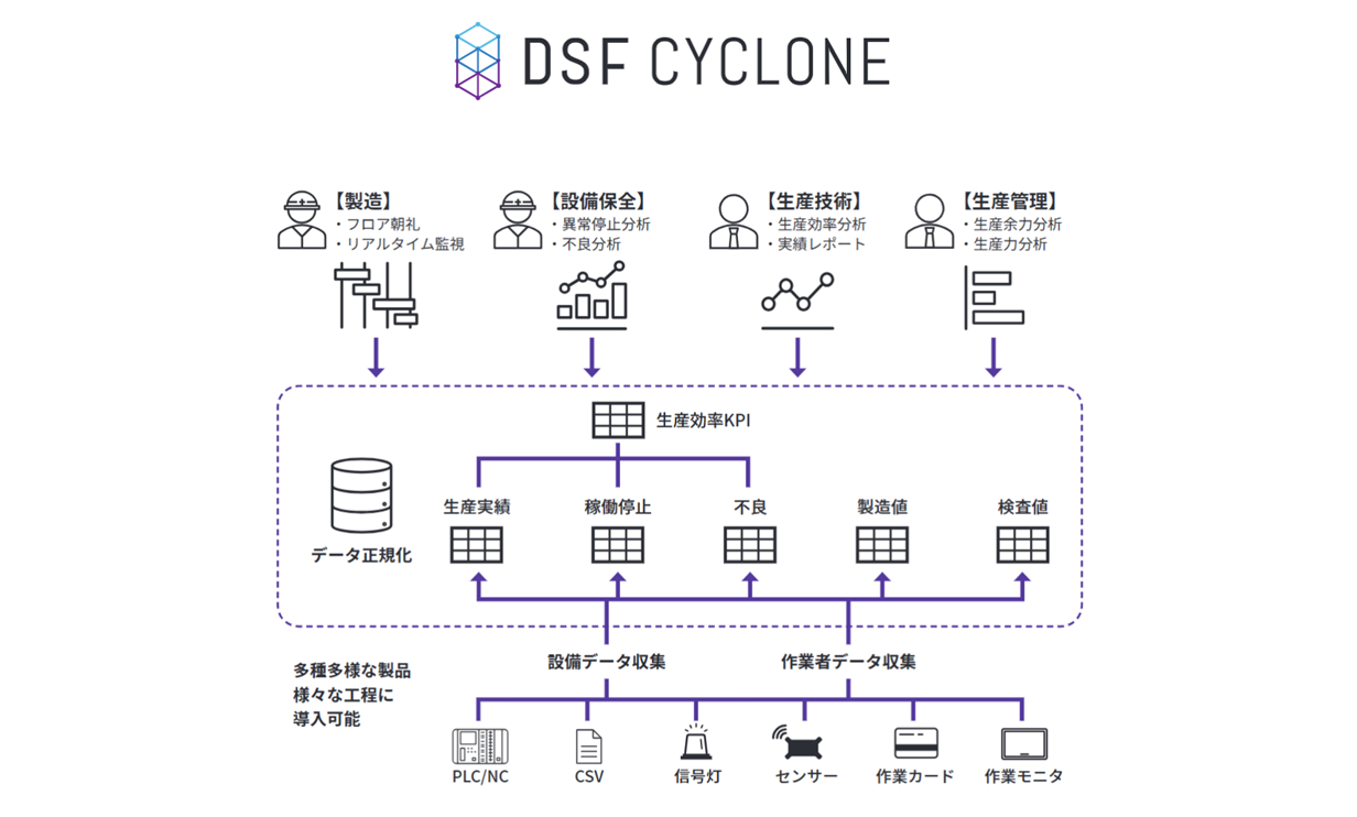 マクニカが提供する「DSF Cyclone」は、生産現場におけるデータの収集・正規化・活用を一気通貫で実現し、現場のデジタル化を推進するソリューションです。製造現場が抱える多様な課題に対し、現場の実績データと生産計画を構造化・可視化することで、迅速かつ高精度な意思決定を可能にします。そのため、従来の経験則に依存した現場運営から、データに基づく改善活動へのシフトを実現し、現場力の強化に寄与します。