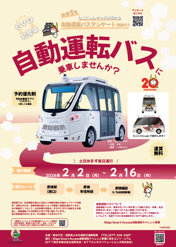 自動運転EVバスで世界をリードする株式会社マクニカ(代表取締役社長:原 一将、以下 マクニカ)とともに、滋賀県における「持続可能な地域交通ネットワークの維持・活性化」等の地域課題の解決に向け、2026 年 1 月 31 日(土)から 2 月 16 日(月)までの 17日間、彦根市内にて初の自動運転 EV バスの実証事業を行います。